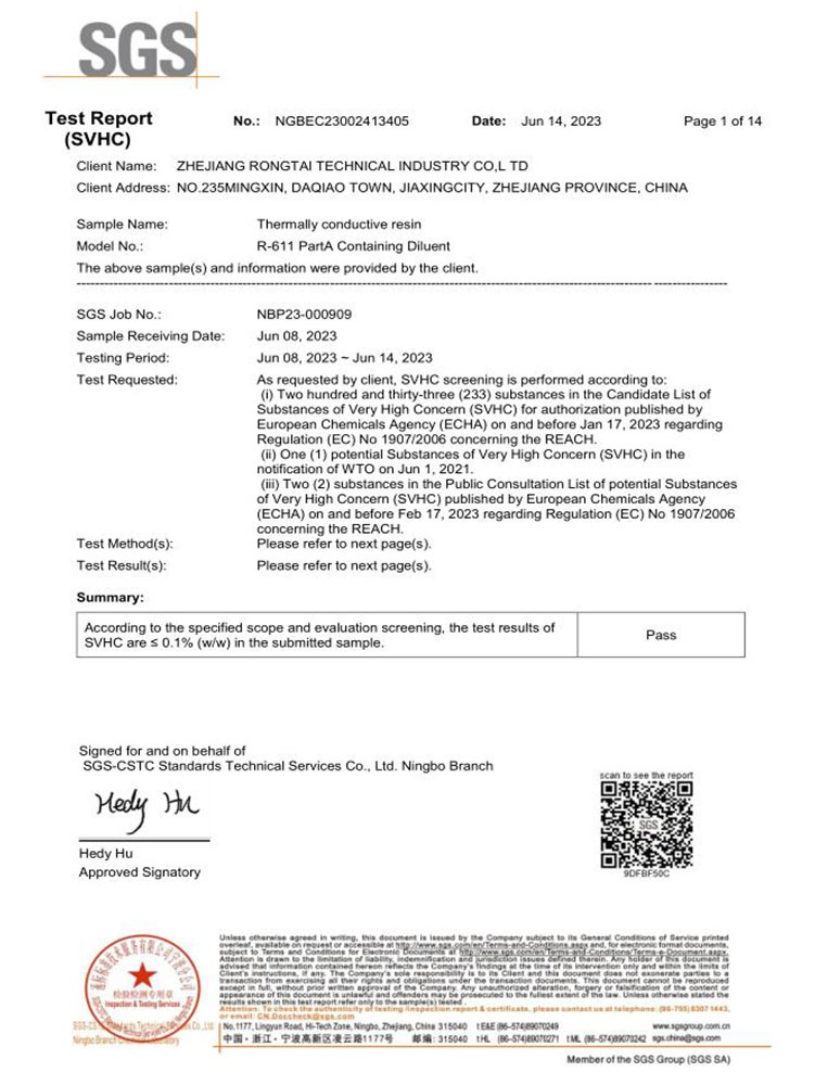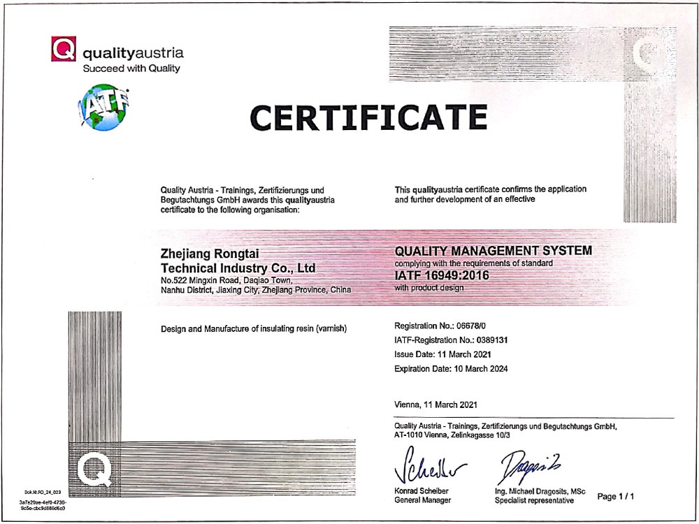 • Zhejiang Rongtai Technical Industry Co.,Ltd. ( Rongtai) is one of the most influential liquid insulation material enterprises in China, established in 1994, with an area of 60,000m2. As a National High-Tech Company, we are certificated by ISO9001, ISO14001, ISO45001 and IATF16959 with CNAS certificated Lab in electrical and electronics industry.